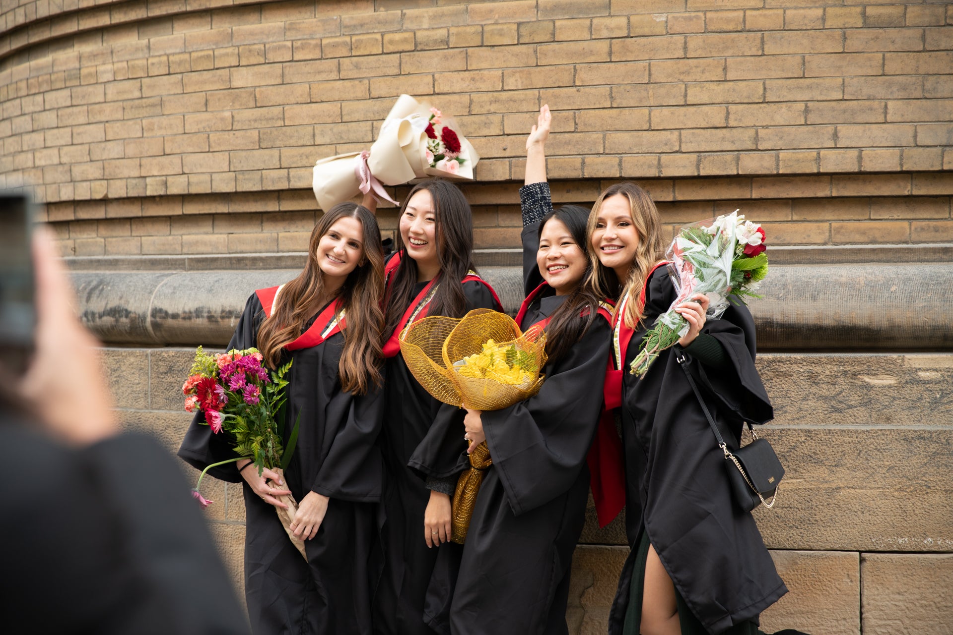Alumnae from the Leslie Dan Faculty of Pharmacy pose for a photo and show off their bouquets in front of Convocation Hall. (Photo by Steve Southon)