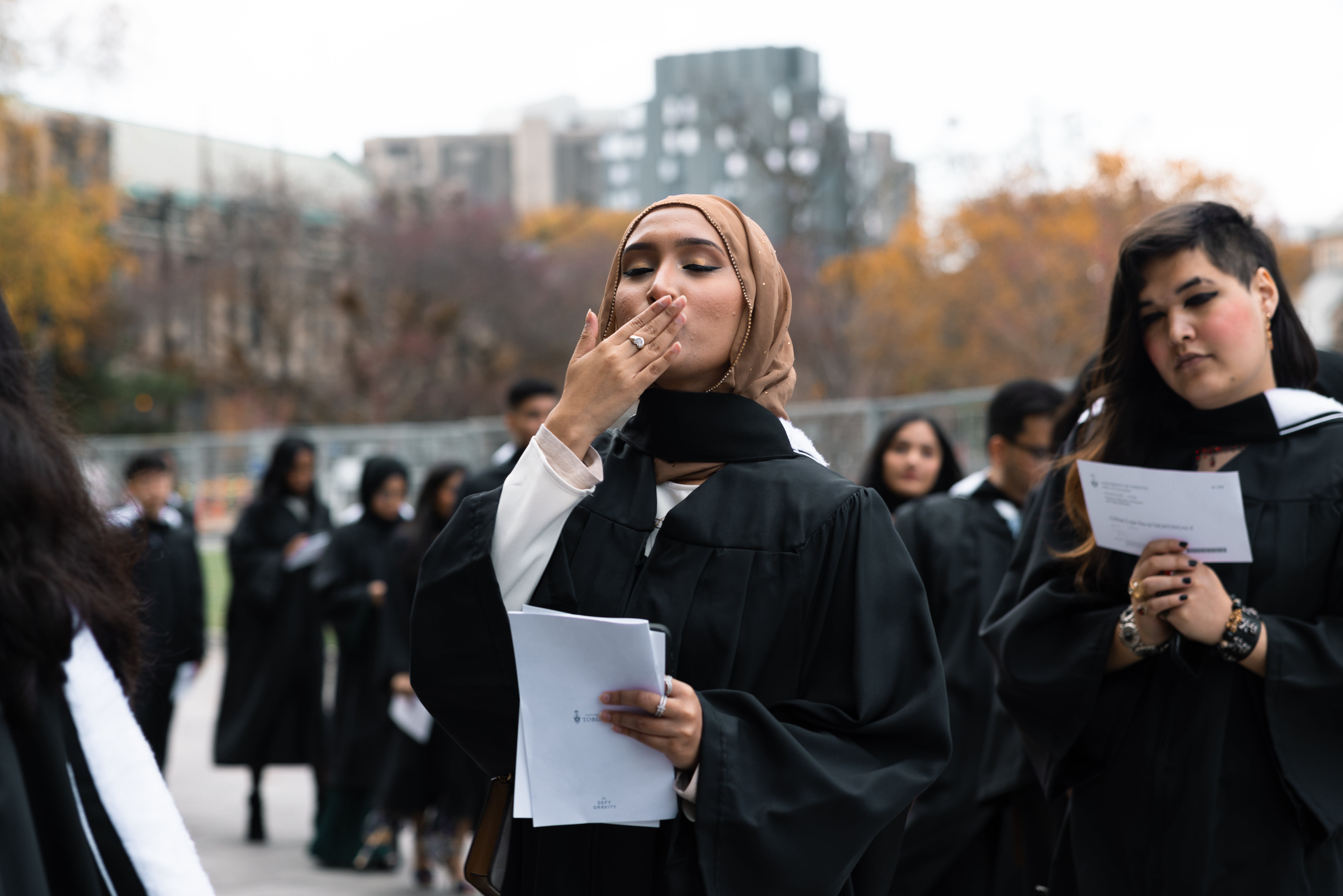 A graduating student from U of T Scarborough blows a kiss before stepping inside Convocation Hall (photo by Nithya Thayaal)