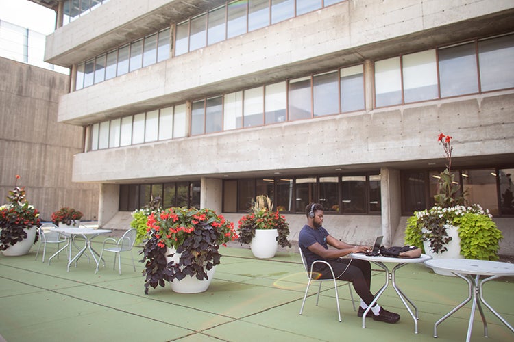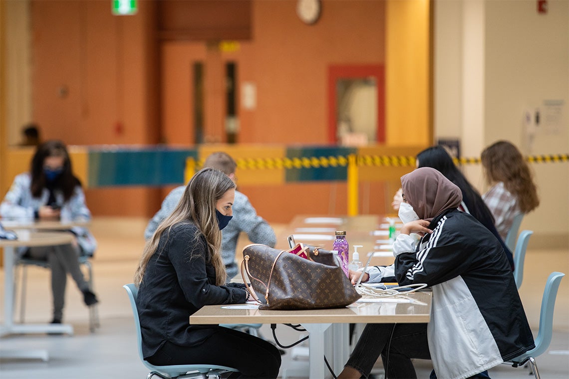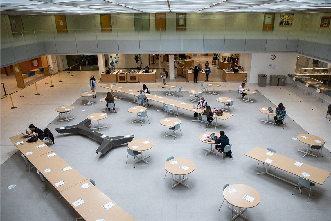 Students at U of T Mississauga keep a safe distance at tables rearranged to facilitate physical distancing.