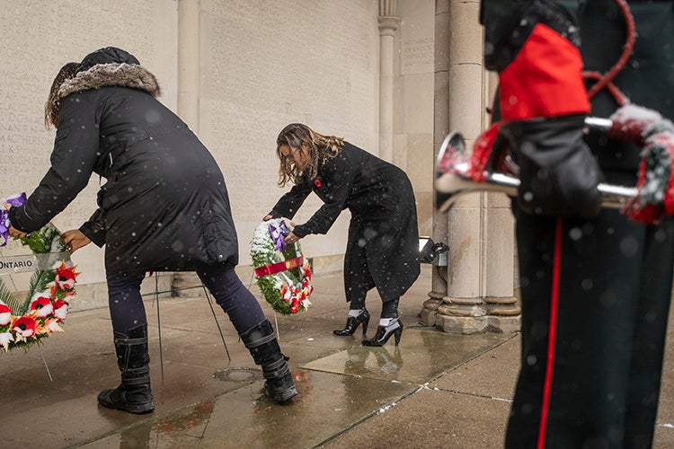 Chrystia Freeland (right), minister of foreign affairs and member of Parliament for University-Rosedale, and Jessica Bell, member of provincial parliament for University-Rosedale, lay wreaths on behalf of the government during the Service of Remembrance on the St. George campus (photo by Nick Iwanyshyn)