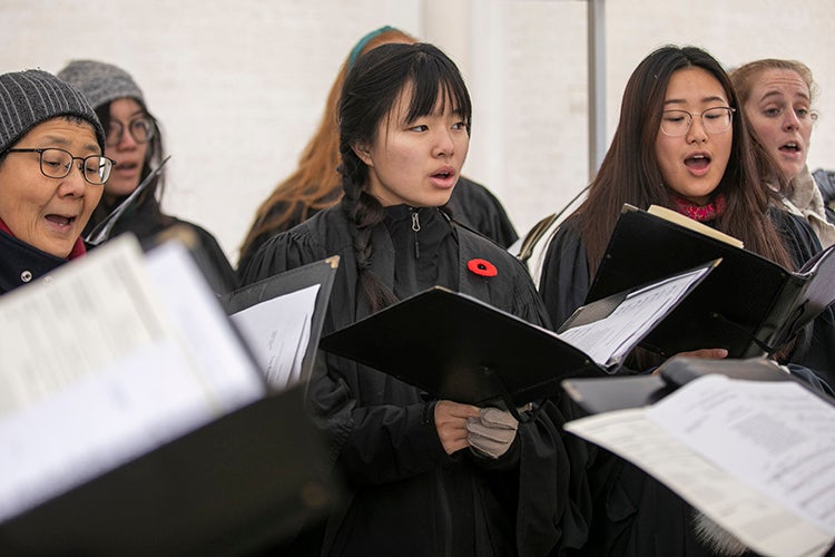 Members of the Hart House Chorus perform a hymn during the ceremonies that took place at Soldiers’ Tower (photo by Nick Iwanyshyn)