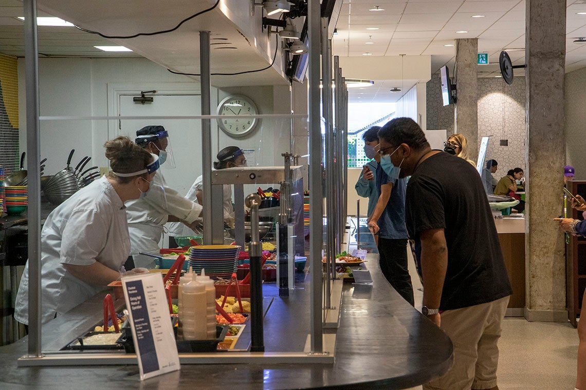 Masked and physically distanced, students line up for lunch at Chestnut Residence on the St. George campus, where in-person dining has returned with a focus on cooking from scratch and made-to-order meals that use local, sustainable and fair trade ingredients. More plant-based options are also available for vegetarians, vegans and anyone looking to increase their intake of leafy greens and vegetables.