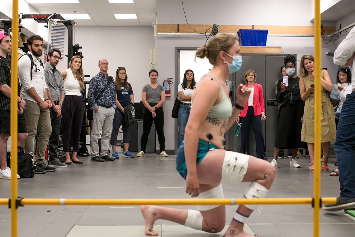 A student in the Biomechanics of Orthopedics and Sport Medicine lab simulates a move that puts stress on the hips (photo by Dewey Chang)