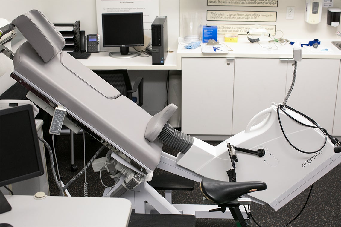 One of the machines Bentley uses in his research is the stress echocardiography tilt-recline table ergometer, a specialized bicycle that allows study participants to exercise while the researchers manipulate them by tilting or reclining the bicycle as needed to obtain optimal images of the heart.