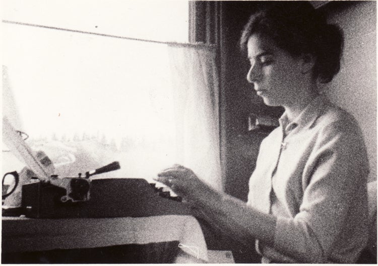 Linda Munk with her portable Olivetti on a train from Moscow to Helsinki in 1958, when, as a U of T undergraduate, she participated in a cultural exchange program in the former Soviet Union and reported on life behind the Iron Curtain for the Toronto Daily Star (photo courtesy of the Munk family)
