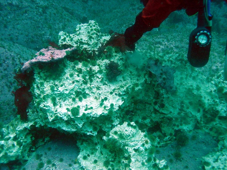 “It’s amazing the amount of sea urchins on the sea floor,” Halfar says, noting there were sometimes layers of urchins stacked on the seabed when he was diving. “I had to use knee pads to get down to the sea floor so the sea urchins wouldn’t puncture my dry suit.”