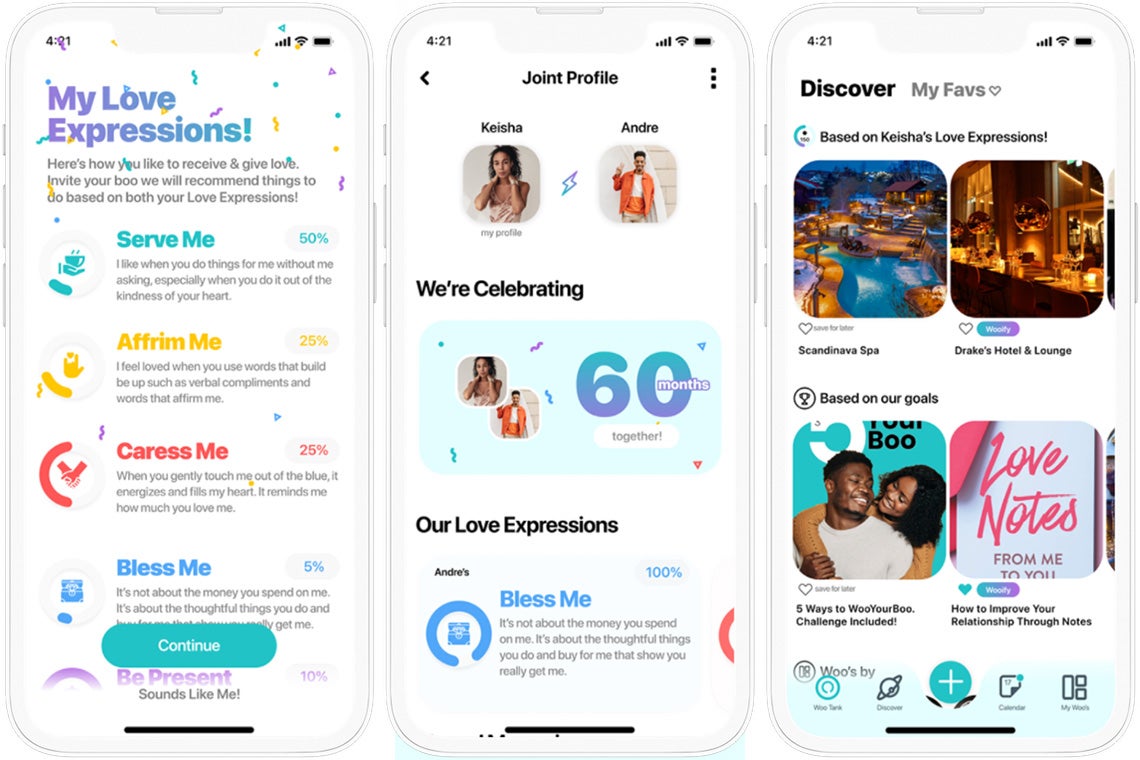 The resulting startup is built on the pair’s learnings as they worked to better communicate their love with each other. The “love expressions” quiz, for example, allows users to swipe through a series of prompts asking them to pick between two romantic options — spending quality time together or getting a small gift. Your “boo” can then take a test to see if they can guess your preferences.