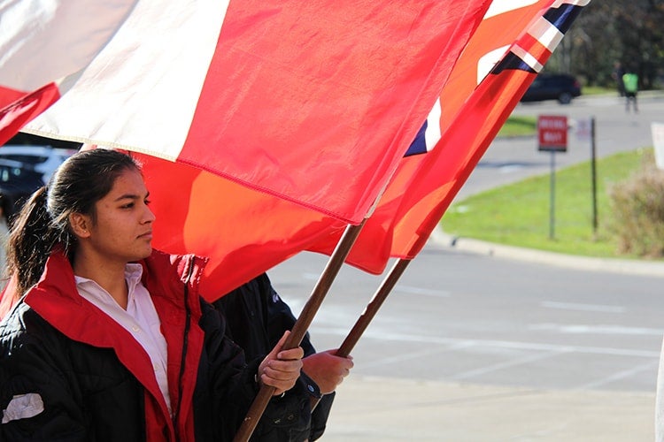 At U of T Mississauga, the ceremony took place at the flagstaff in front of the Davis Building. Flag bearers included student Shireen Gupta of the Erindale College Special Response Team of the St. John Ambulance (photo by Blake Eligh)