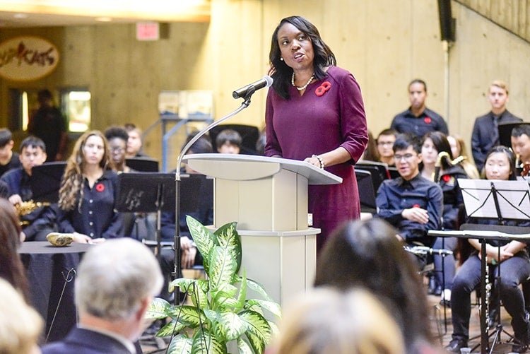 Ontario’s Education Minister Mitzie Hunter, a of U of T Scarborough alumna and MPP for Scarborough-Guildwood, spoke at the ceremony at the Scarborough campus (photo by Ken Jones)