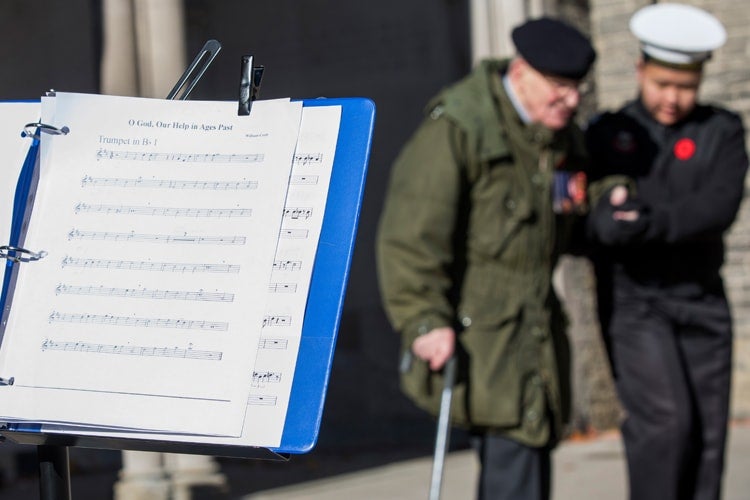 Young cadets help veterans during the laying of the wreaths. Among the hymns sung at U of T's downtown Toronto campus was “O God, Our Help in Ages Past” by Isaac Watts and William Croft (photo by Laura Pedersen)