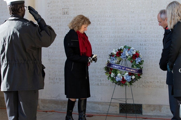 U of T President Meric Gertler and Provost Cheryl Regehr begin the laying of the wreaths at the downtown Toronto campus (photo by Laura Pedersen)
