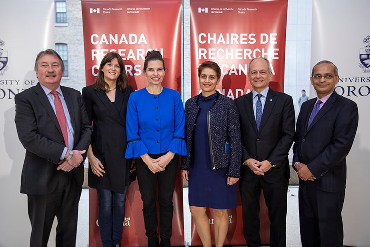 From left to right: SSHRC President Ted Hewitt, Assistant Professor Angela Schoellig, Federal Science Minister Kirsty Duncan, Professor Rama Khokha, U of T President Meric Gertler and U of T Vice-President, Research and Innovation Vivek Goel (photo by Nick Iwanyshyn)