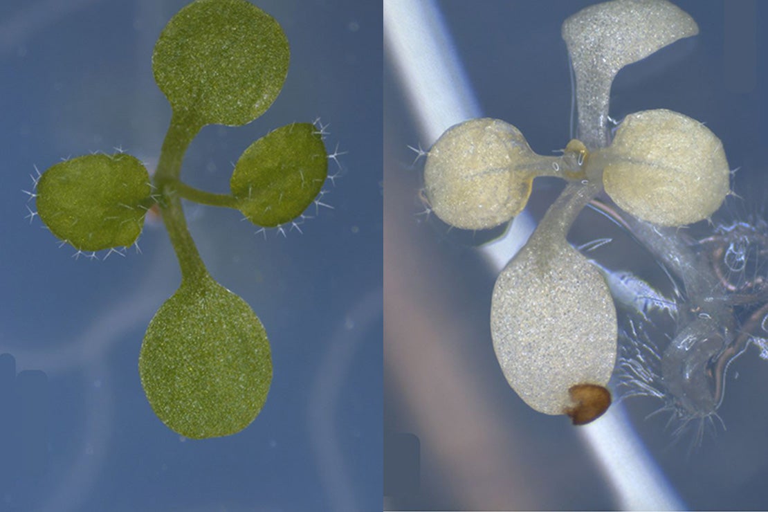 Normal and albino Arabidopsis seedlings, with the latter missing the activity of the SKL1 protein that enables plants to convert light into energy through photosynthesis (photo by Thanh Nguyen)