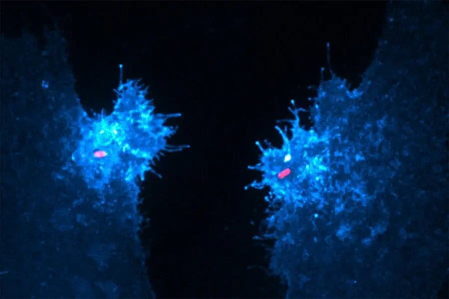 Two human epithelial cells [that] express a fluorescent biosensor specific for the lipid (in blue) were exposed to invasive salmonella (in red). In their study, Walpole and his collaborators reveal that this lipid, which supports bacterial entry and host survival, is generated by an unconventional phosphotransferase reaction driven by the secreted salmonella protein SopB.