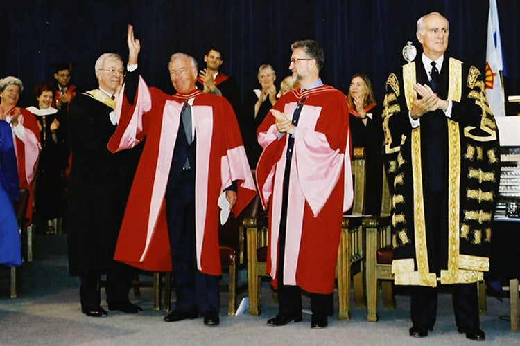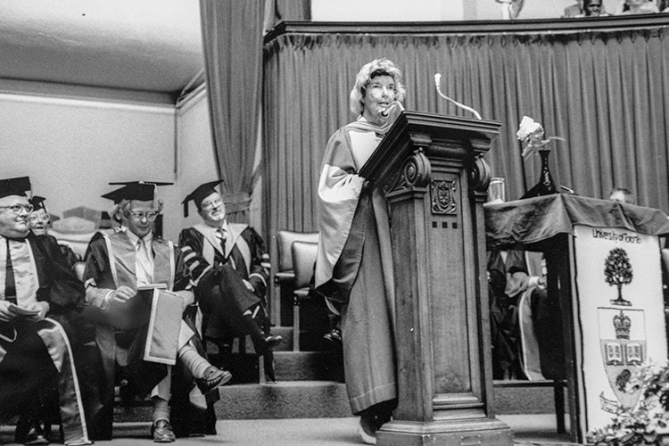 At spring convocation in 1992, Roberta Bondar was awarded a Doctor of Science, in the category of “Academic Disciplines and Professions – Aeronautics.” The honour coincided with the 25th anniversary of Erindale College (known today as U of T Mississauga). Bondar, the first Canadian woman in space, has a PhD in neuroscience from U of T.