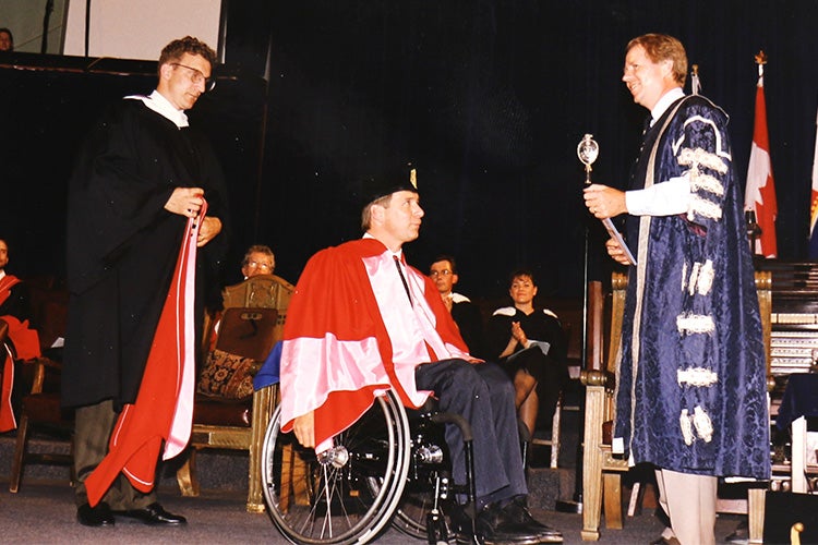 In June 1995, former Paralympian and humanitarian Rick Hansen received a Doctor of Laws in the “Public Affairs” category. Hansen, who was left paralyzed from the waist down after an accident in his youth, won six Paralympic medals and three world championships in wheelchair racing. He founded the Rick Hansen Foundation in 1988 to fund spinal cord research and to change attitudes toward people with disabilities and remove barriers.