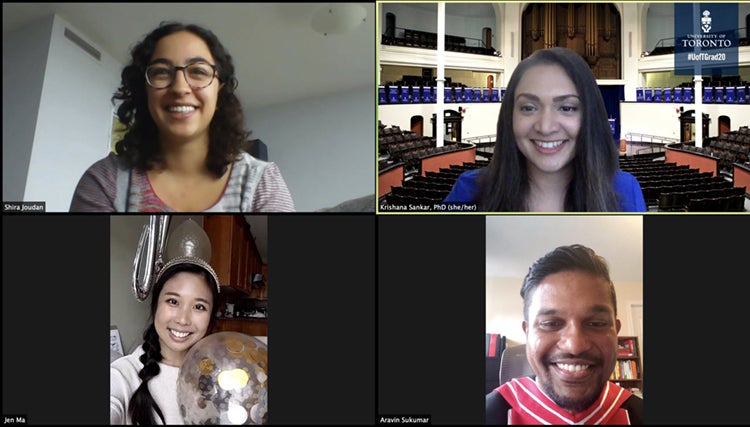 Shira Joudan, who graduated with a PhD in environmental chemistry, watched the ceremony from her couch while texting with her parents in Winnipeg. After the event, she joined a spontaneous Zoom chat organized by U of T students graduating with doctorates in science.