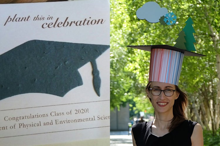 Ellen Gute, meanwhile, tweeted a photo of herself after her thesis defence in August when she had an unusual cardboard mortarboard perched atop her head. The mortarboard depicts ice crystal formation on a tree pollen in a cloud, a reference to her PhD research on the effects of atmospheric processing on pollen ice nucleation ability under cold and mixed-phase cloud conditions.