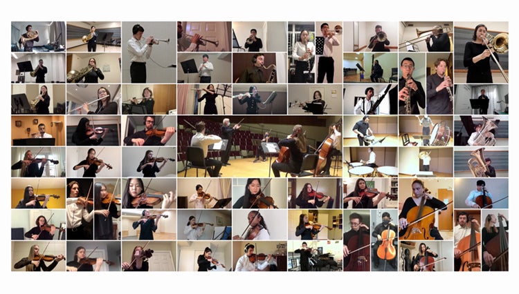 And, in a first for the university, the national anthem was performed by the U of T Symphony Orchestra and U of T Wind Ensemble, with each musician recording their part separately from kitchens, living rooms and bedrooms across the Greater Toronto Area. More than 60 student musicians appeared on screen in a Zoom mosaic to play a version of O Canada that was arranged by John Fenwick, a U of T Faculty of Music graduate, and mixed by Jeff Wolpert, the director of music technology and digital media program.