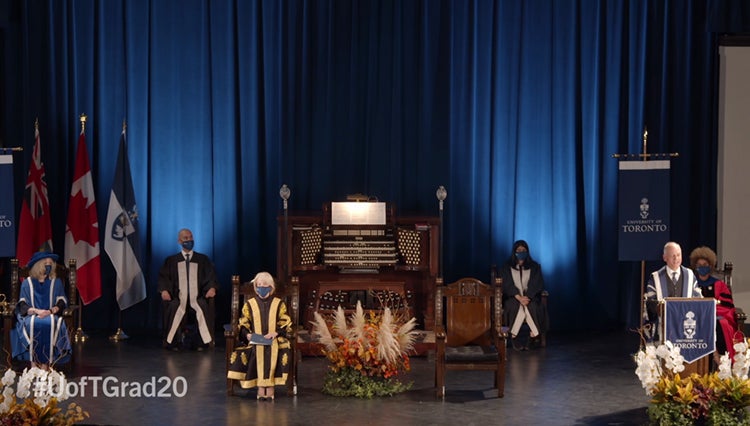 The virtual fall ceremony included many time-honoured U of T traditions: a graduation procession from Simcoe Hall in traditional attire, a bedel carrying U of T’s mace, two esquires carrying the staves, an exchange in Latin between the president and chancellor, organ music by U of T’s John Tuttle and the sound of the carillon bells from Soldiers’ Tower. The bedel for the ceremony was Claire Kennedy, chair of Governing Council, while Marium Vahed and Amin Kamaleddin, both student governors, served as esquires.