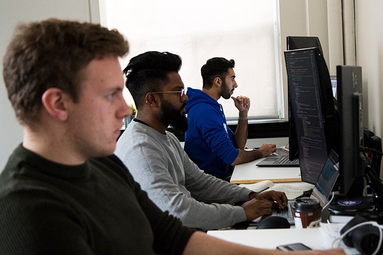 Structura Biotechnology's team work out of U of T's Banting building, which also houses the ONRamp co-working and collaboration space. From left to right: Ali Haydaroglu, Stephan Arulthasan and Suhail Dawood (photo by Chris Sorensen)