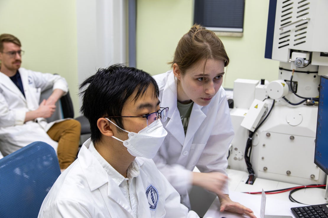 PhD candidates Maria Stanko (right) and Dian (Jack) Yu study images generated by energy-dispersive X-ray spectroscopy. Post-doctoral researcher Michel Haché looks on in the background (photo by Aaron Demeter)