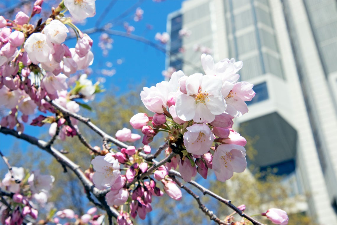 Warm spring weather means the cherry blossoms outside of Robarts Library at the University of Toronto are finally blooming.