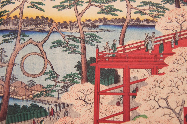 Japanese artist Andō Hiroshige captured cherry blossoms in bloom outside Kyoto’s Kyomizu Hall in the 1800s, printed here in the 2007 book Meisho Edo hyakkei: hizō Iwasaki korekushon