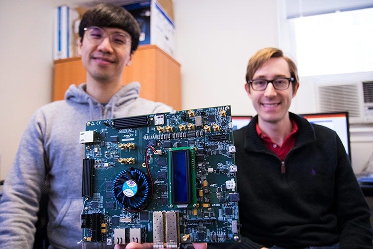 Jongsok Choi and Andrew Canis of LegUp Computing show off an FPGA board inside their UTEST office (photo by Chris Sorensen)