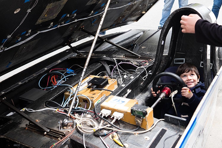 Bulent, 3, looks up at his dad and MBA student Levent Timur from the wheel of Polaris, a solar-powered vehicle made by U of T's Blue Sky Solar Racing Team (photo by Geoffrey Vendeville).