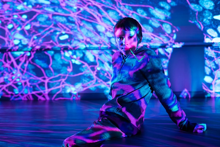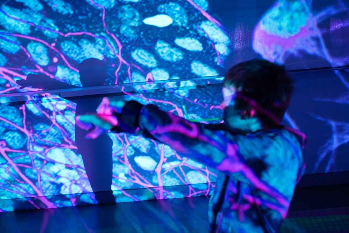 Mason Godkewitsch, 8, poses for a photo inside the cell cave in the McLennan building at the downtown campus. The images on the walls are neural cells that started as pluripotent cells in the lab of Radha Chaddah, a visual artist who obtained a master of science in cell and molecular neurobiology (photo by Geoffrey Vendeville).