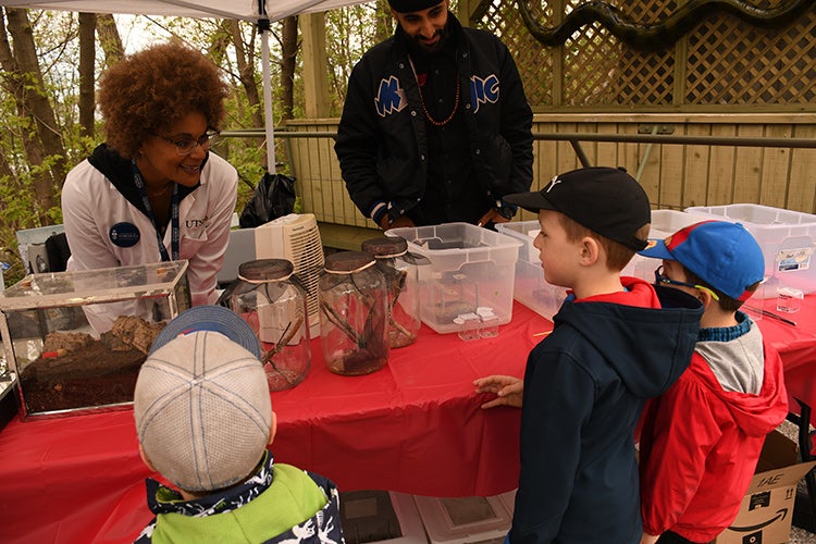 At the University of Toronto Scarborough, young visitors learned about spiders from Maydianne Andrade (left), a professor of biological sciences and Canada Research Chair in Integrative Behavioural Ecology (photo by Sara Weales).