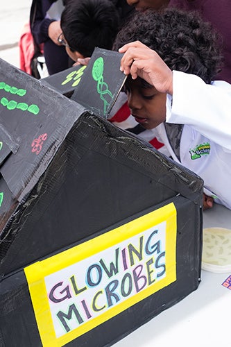A boy looks inside a box containing glowing microbes. Scientists from the Centre for the Analysis of Genome Evolution & Function (CAGEF) displayed naturally fluorescent bacteria and bacteria that were made to glow with a gene from jellyfish.