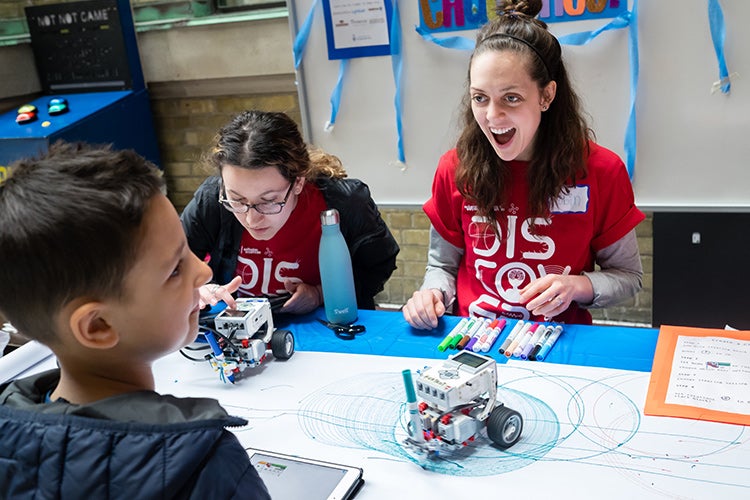 Master of teaching students Robin Connolly (right) and Isabella Vitale entertain a young visitor to the Ontario Institute for Studies in Education booth (photo by Geoffrey Vendeville)