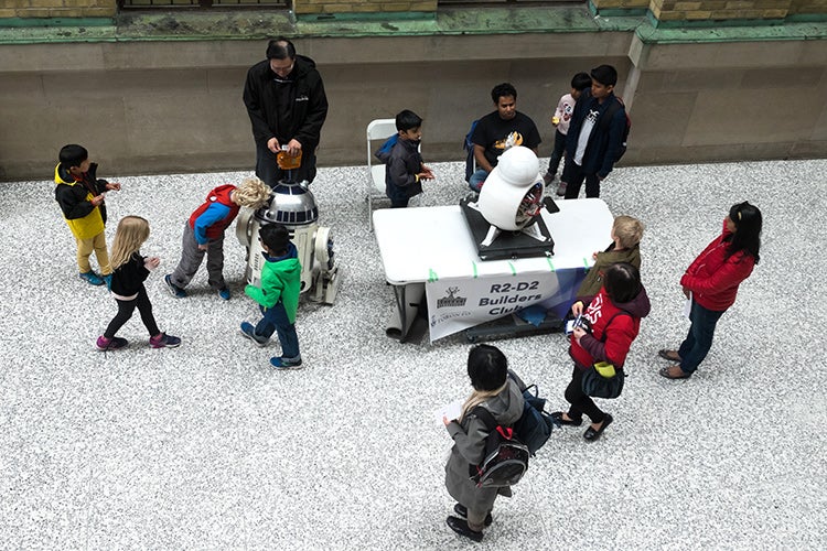 Kids inspect an R2-D2 replica made by the R2-D2 Builders Club at the Bahen Centre (photo by Geoffrey Vendeville).