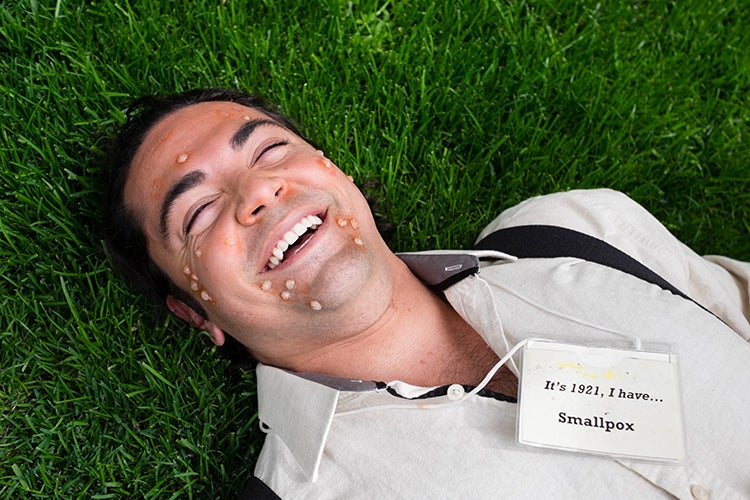 Mo Waja is the happiest man with smallpox. He dressed up in period garb for the Dalla Lana School of Public Health’s exhibit of contagious diseases, including whooping cough and measles. (photo by Geoffrey Vendeville)