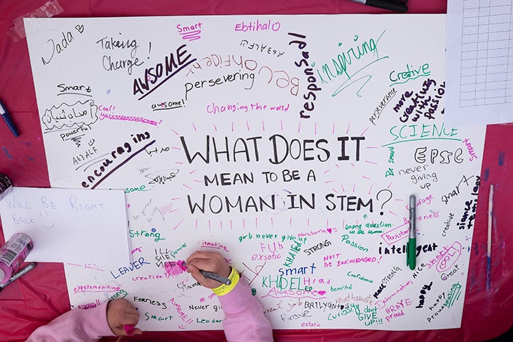 A girl adds to a poster about what it means to be a woman in science, technology, engineering and math (STEM) (photo by Geoffrey Vendeville).