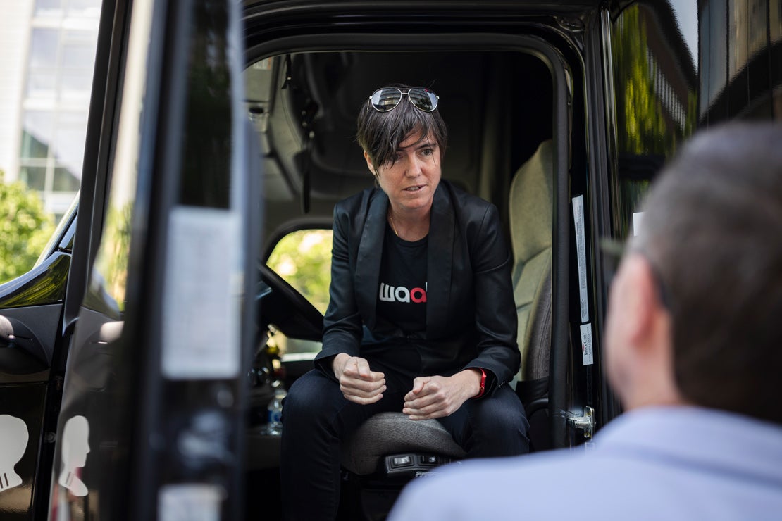 Waabi CEO Raquel Urtasun, a professor of computer science in U of T’s Faculty of Arts & Science, sits in the cab of a truck equipped with self-driving technology (photo by Nick Iwanyshyn)
