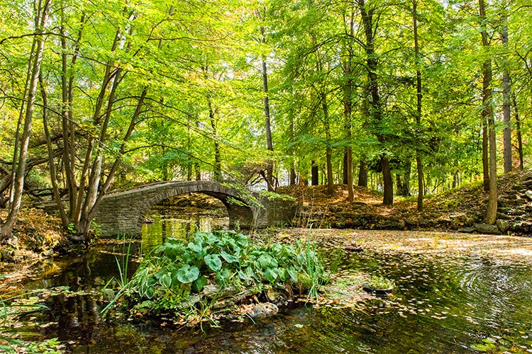 The stone bridge across Watkins Pond is nestled in a grove of trees (photo by Randy Landicho)