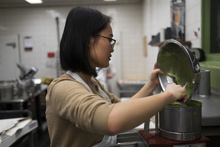 Ailin Xi, a biochemistry and nutrional sciences student, is splattered with green pea and pepper puree during the Iron Chef competition trial (photo by Geoffrey Vendeville)