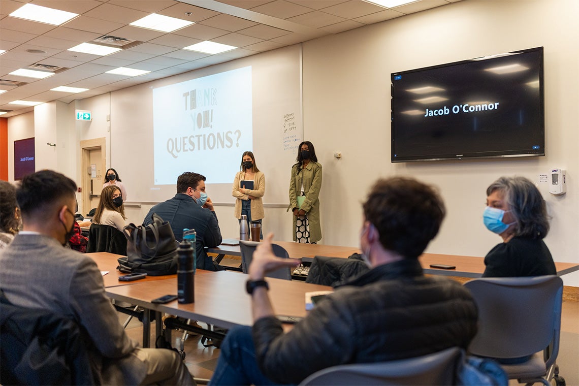 Another presentation saw students outline findings from their topic “Investigating Incentives and Disincentives in the Transition to Zero-Emission Vehicles in Toronto.” The group – Luca Dannetta, Sarah Klein, Anna Lazaris, Tingwei Lyu and Arnaud Nsamirizi – explored approaches taken by global municipalities to incentivize the switch to zero-emission vehicles and promote active transportation and public transit.