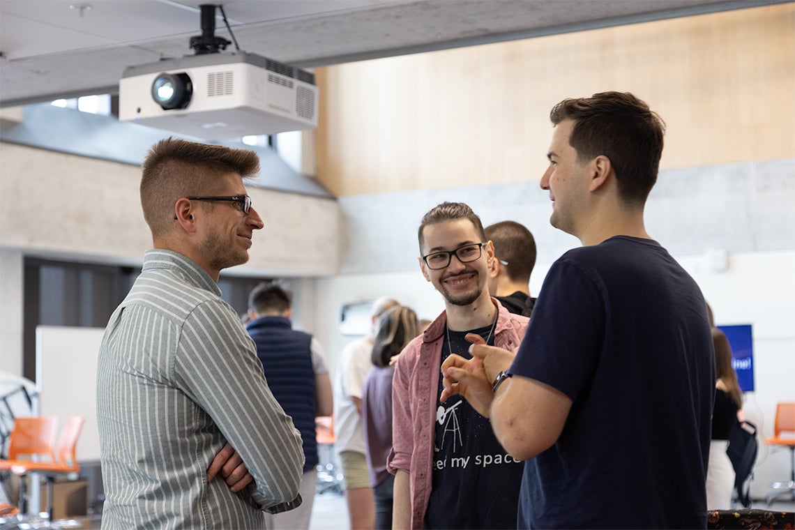 U of T researcher Brokoslaw Laschowski, left, speaks with Anton Zaliznyi and Bohdan Pikula at a recent event to welcome students from Ukraine who are participating in a computer science summer research program (photo by Polina Teif)