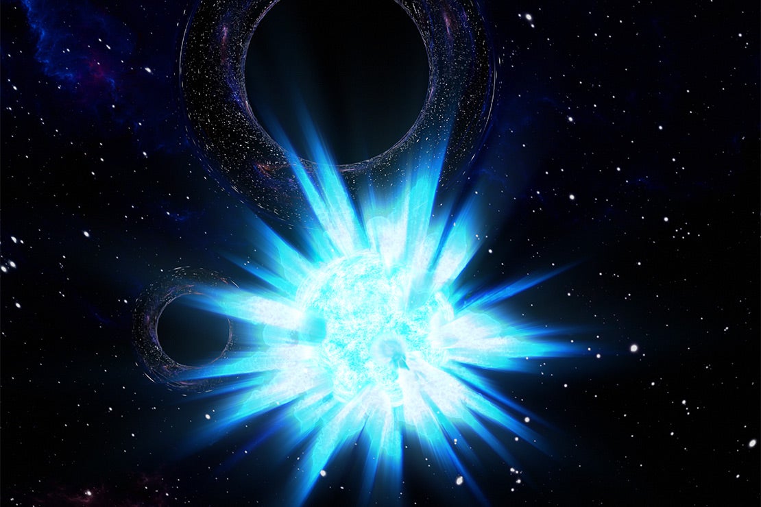 Artist's impression of a stellar explosion with hints of a black hole binary in the background, released on April 1, 2026 (Illustration by Carl Knox, OzGrav–Swinburne University of Technology)