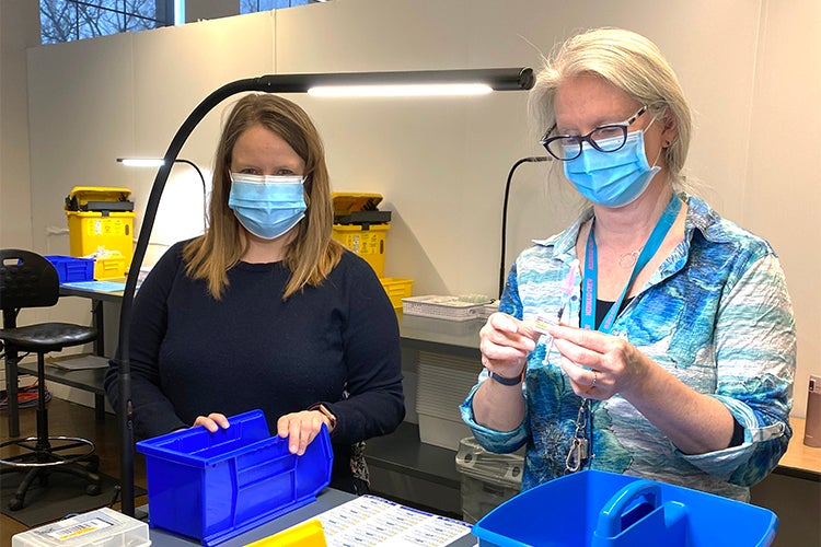 Natalie Crown and Linda Dresser, both assistant professors in the Leslie Dan Faculty of Pharmacy, prepare for a training session at the U of T St. George vaccine clinic (photo by David Dubins)