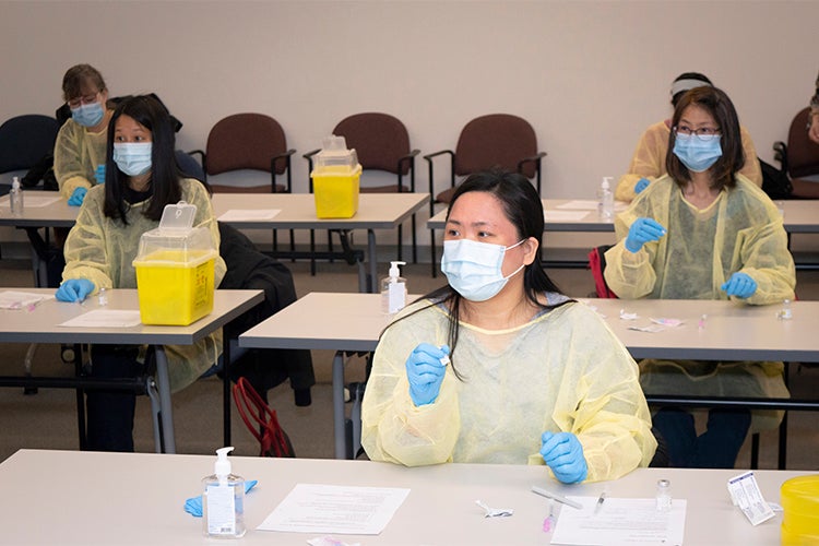 During each in-person session, a pharmacy technician provided a refresher on aseptic technique, demonstrated the vaccine preparation steps, coached the pharmacists as they practised doing these steps themselves and built confidence in handling the delicate vials.