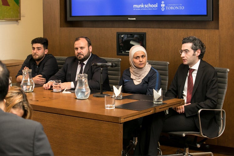 (From left) Al Khalf, Mustafa, Al Masri, and Habib share their experiences at the Munk School of Global Affairs & Public Policy on the downtown Toronto campus (photo by Dhoui Chang)