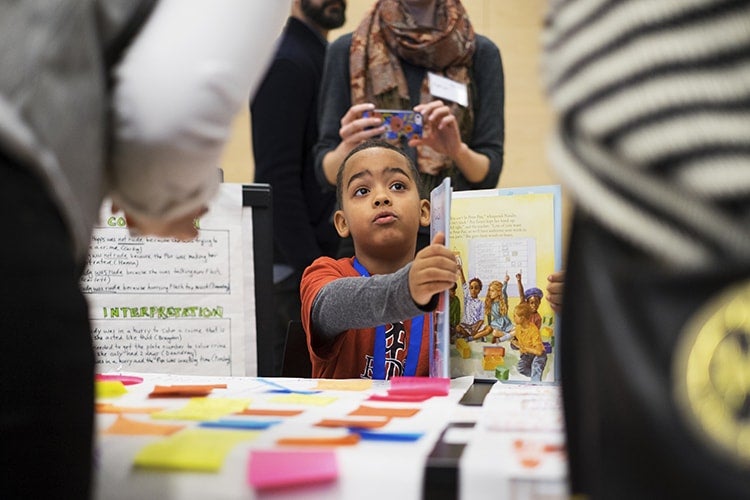Deandray Spencer presents a class project on the children's book “Amazing Grace” by Mary Hoffman (photo by Geoffrey Vendeville)