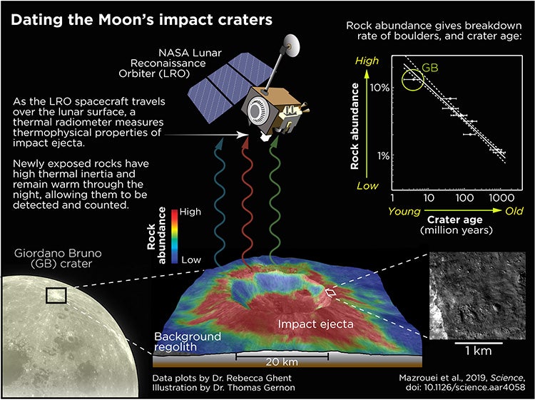 This image depicts the method by which the Diviner instrument on the Lunar Reconnaissance Orbiter senses the heat emanating from the lunar surface, which allows scientists to map the abundance of rocks around young impact craters. The team used this information to estimate ages for lunar craters larger than 10 kilometres in diameter. Young craters have lots of rocks near their rims, and those rocks break down into smaller particles over time, disappearing from the Diviner thermal data (data plots by Rebecca Ghent; illustration by Thomas Gernon)