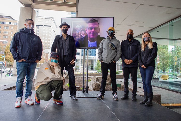 Artists participating in the mural project, including (from left) Alexander Bacon, Que Rock, Christiano De Araujo and Jason Pinney, as well as representatives for Keitha Keeshig-Tobias Biizindam and Emmanuel Jarus, pose for a picture with Darrell Fox (photo by Johnny Guatto)