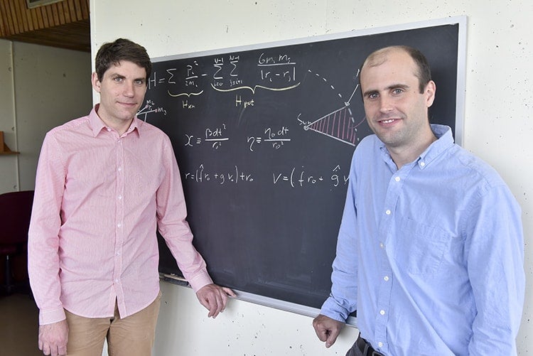 Assistant Professor Hanno Rein (left) and postdoctoral fellow Dan Tamayo from the Centre for Planetary Sciences wanted to see what the long-term fate of the Tesla Roadster would be after it was launched into space (photo by Ken Jones)